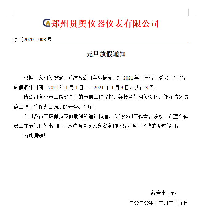 鄭州貫奧儀器儀表有限公司-2021元旦放假通知